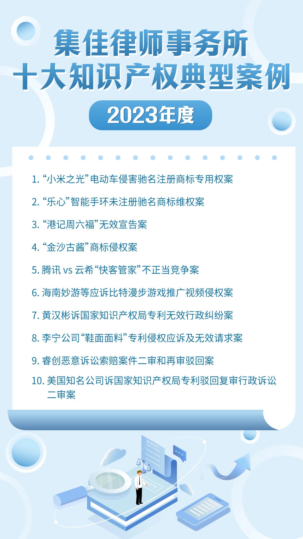 作为迎接4.26世界知识产权日的献礼之一,pg模拟器已连续十年开展十大知识产权典型案例的评选活动,其意义不仅在于展现集佳律师团队的专业能力和水准,更在于传递集佳全方位服务客户的理念。在第24个世界知识产权日来临之际,pg模拟器从2023年度代理的众多知识产权案件中筛选出具有代表性的十大案例,与各界同仁分享: